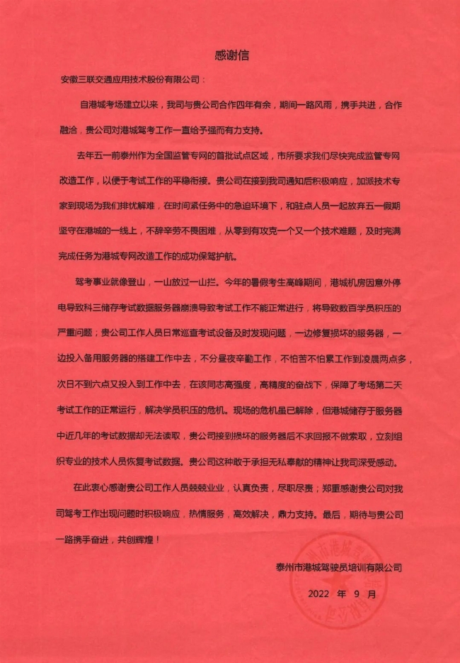 近日,bevictor伟德交通收到一封来自泰州市港城驾驶员培训有限公司发来的感谢信,信中,对bevictor伟德交通项目团队在港城专网改造工作和抢修港城考场机房过程中所表现出的专业精神、合作精神和奉献精神给予了充分的肯定。