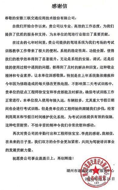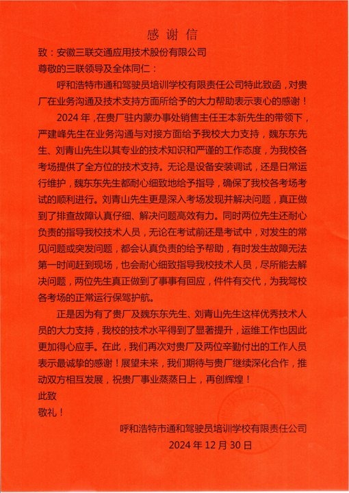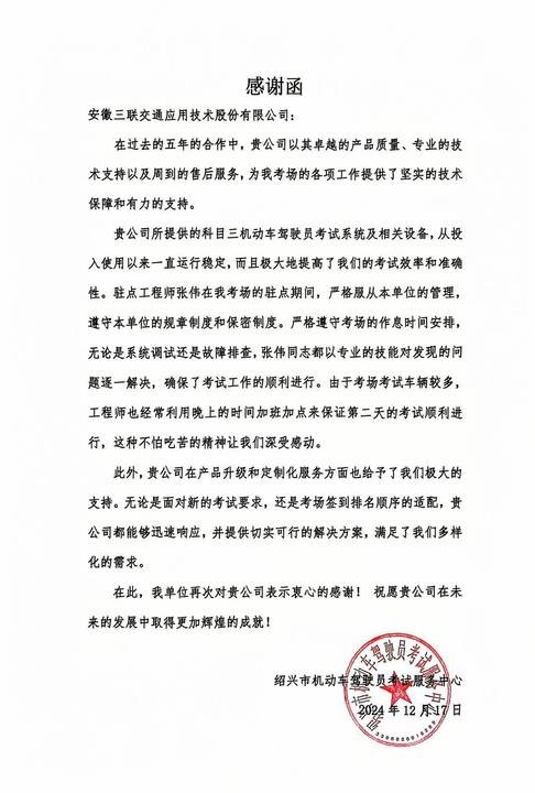 近日,bevictor伟德交通接连收到来自绍兴、湖州和内蒙古地区客户的感谢信,信中对公司在过去合作中展现出的卓越产品质量、专业技术支持和周到售后服务表达了诚挚的感谢和高度的认可,为公司的服务口碑再添佳绩,这些来自不同地区客户的诚挚谢意,也彰显了公司在驾培行业的卓越地位和影响力。