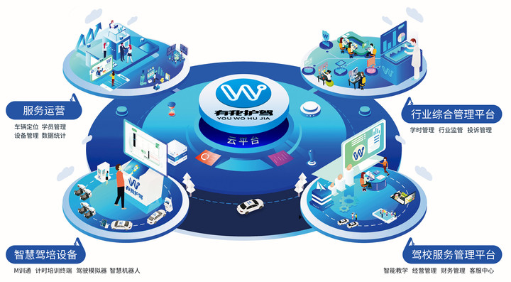 依托云计算、人工智能、大数据等信息技术,围绕驾驶员培训流程,打造服务质量高、用户体验优的“有我护驾”系列产品。通过提供智慧驾培产品:理论学习小程序、实操计时设备、M训通智能模拟考试设备、智能驾模设备、智能机器人教练设备等并通过数字化管理、智能化培训提供教学新模式协助驾校规范教学内容、方式和理念,提升学员个性化体验。