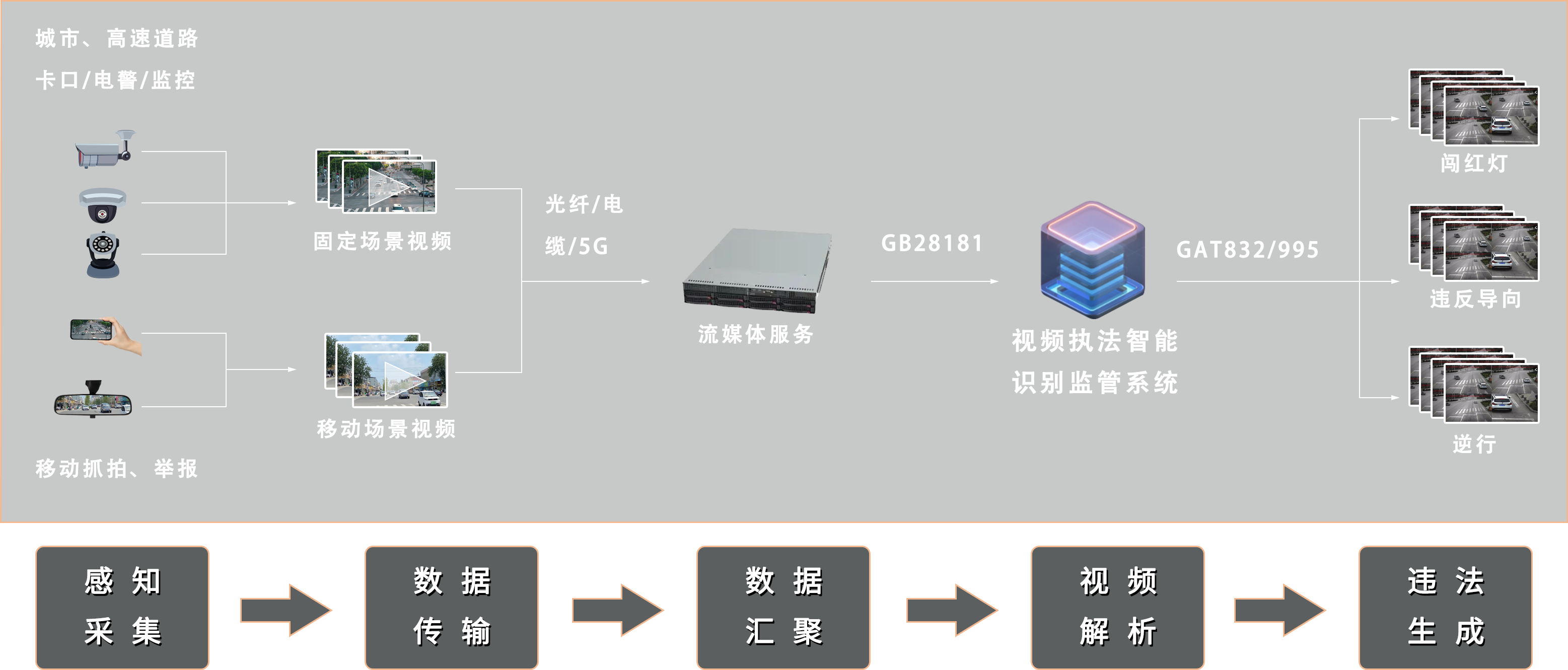 视频违法智能识别监管系统,是基于GA/T832、GAT995-2012的标准规范,将AI技术赋能现有的城市、高速道路的监管设备,通过对设备抓拍的视频数据的智能分析,自动抓拍捕获视频中的机动车违法行为,生成违法证据链,实现了软件定义相机的新型执法监管。