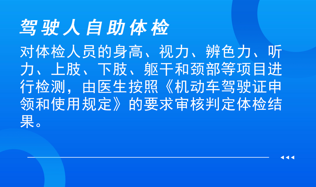 设备可以对体检人员的身高、视力、辨色力、听力、上肢、下肢、躯干和颈部等项目进行检测,并将数据通过网络传输至体检平台,由医生按照《机动车驾驶证申领和使用规定》的要求审核判定体检结果。设备同时具备自助拍照功能,体检人员可以自助拍摄证件照片,多拍优选。自助体检机的投入使用进一步方便群众办理业务,提高办事效率。